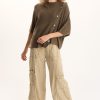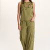 Flattering seaming and ruching at the front leg brings plenty of curve-conforming detail to this soft twill, banded leg pant. A contrast rib pull-on elastic waistband and cargo pockets with twill tape and antique brass hardware details finish off this style.