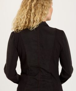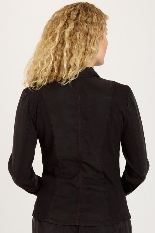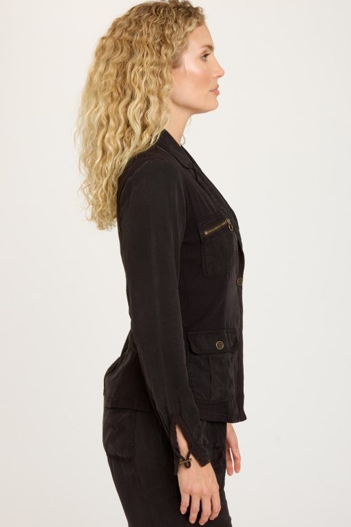 Single button blazers for a cinched waist and ultimate style! Tula features contrasting inserts for a flexible and impeccable fit, drawstring and slider at the cuffs, zippered breast pockets, and flapped snap pockets near the hem.