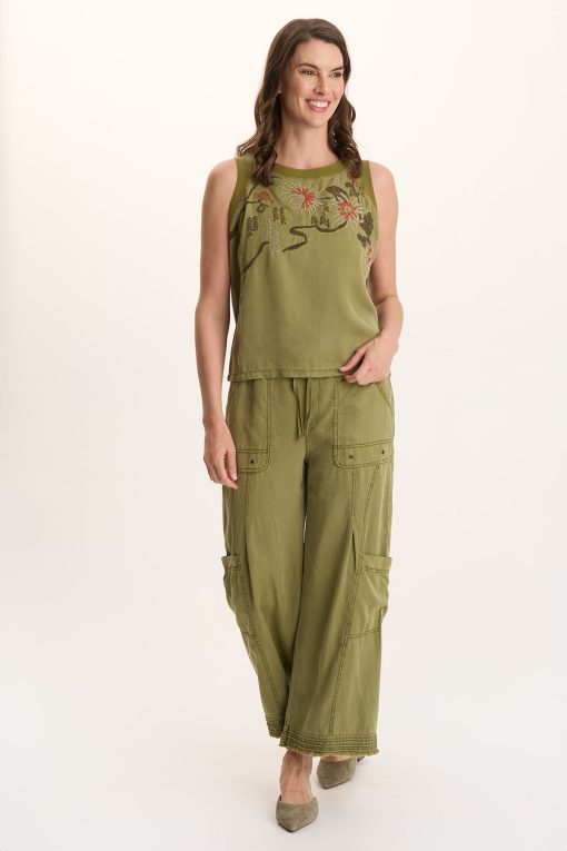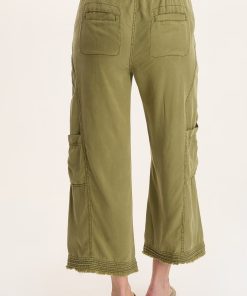 A stretchy, thick knit drawstring waistband ensures extra comfort on this wide-leg Soft Twill cargo style. Plentiful pocket, an added central pleat at the leg for added soft volume, and raw-edge hem round out the utility-inspired style.