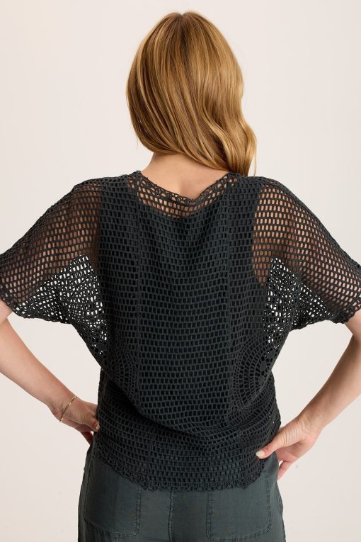 A circular crochet design adorns the side seams of this mesh crochet top. Centre Top has an attached jersey lining and a decorated v-neck.