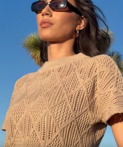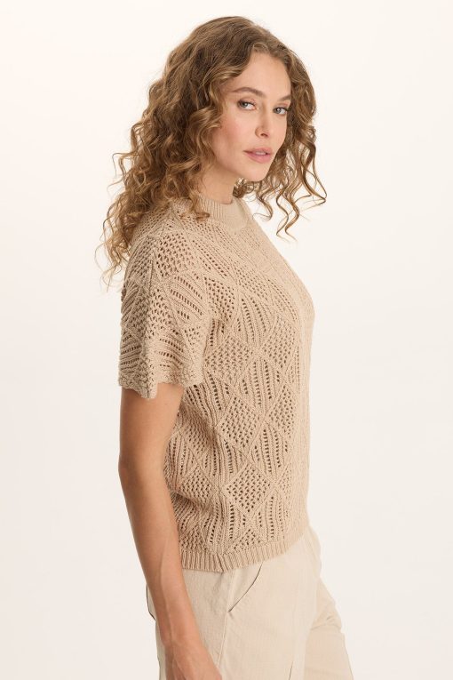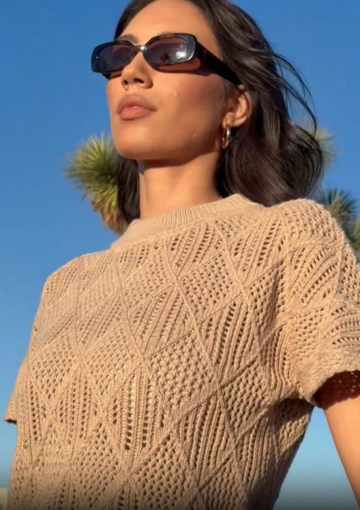 Diamond-knit Cali Cotton graces this short-sleeve mock-neck top. She’s a sweater with the endless possibilities of a tee—all in one swell package!