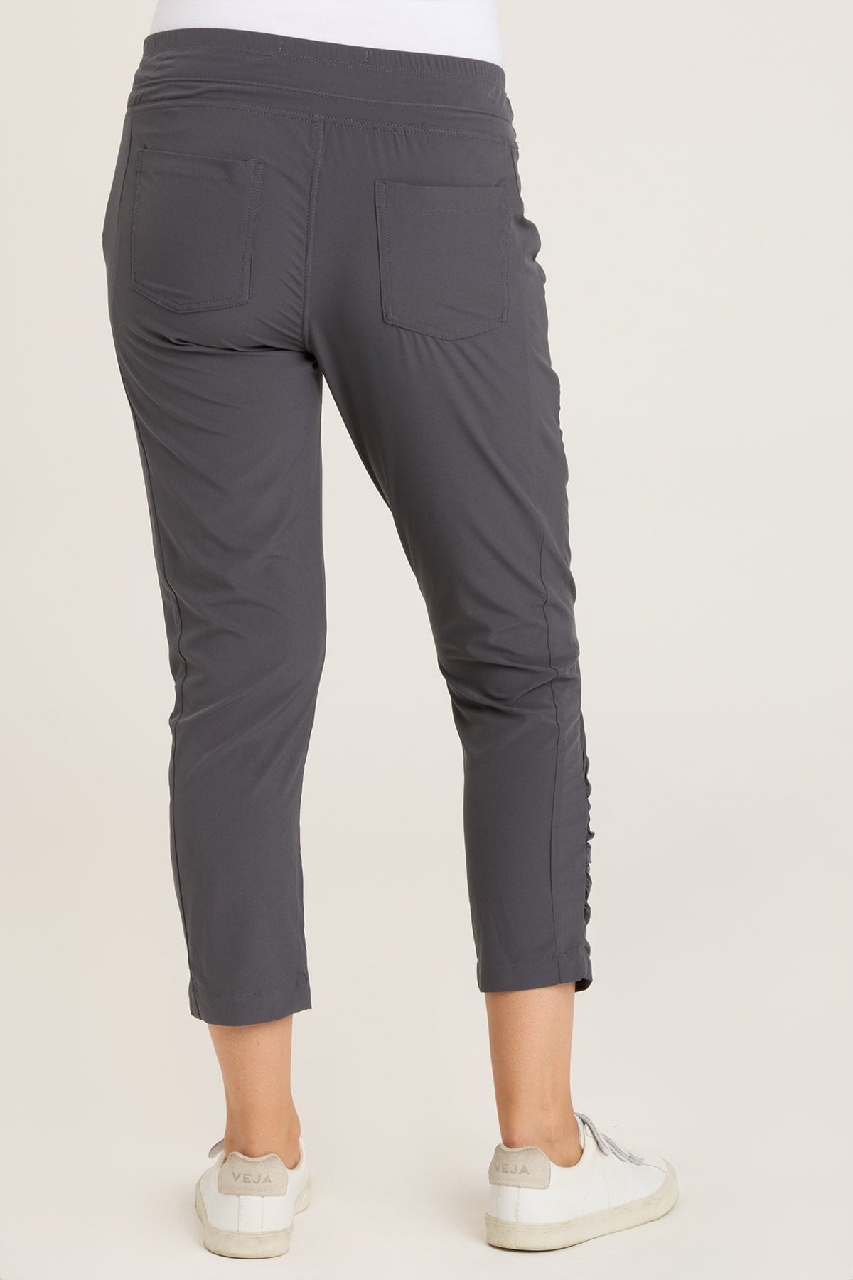 A Jetter spin off; this active legging features a drawstring waist, front pockets with zipper details, our classic ruched leg panels, back pockets and enough sass to keep you going all day!
