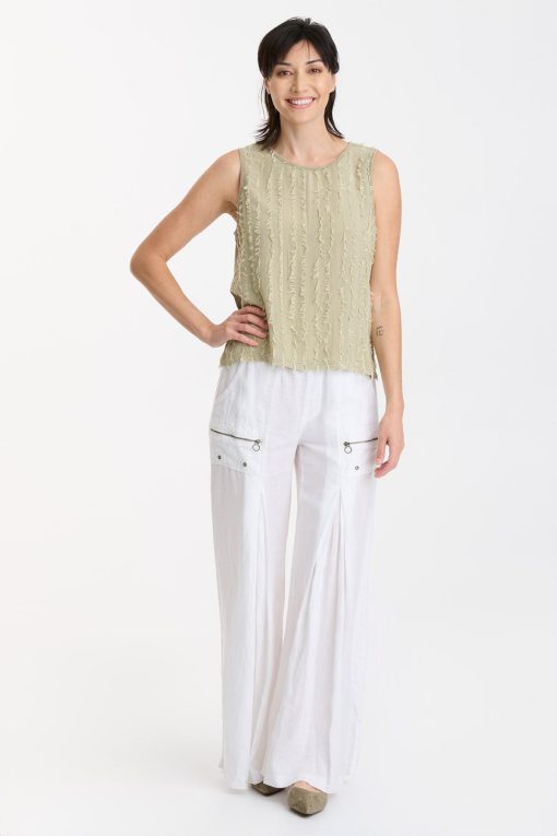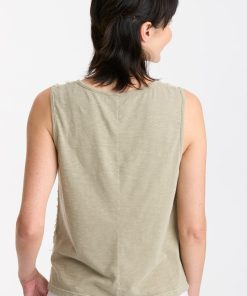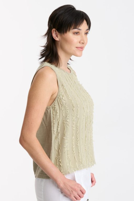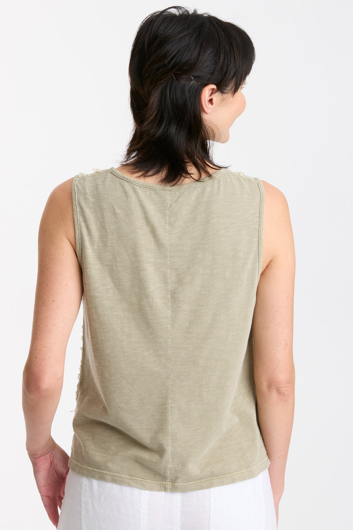 A jacquard-woven novelty tank with a crew neckline, side slits, and a contrasting slub jersey back panel.
