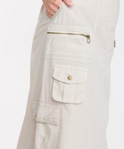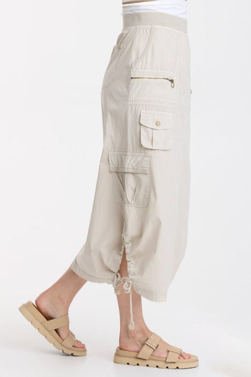 Cinchable cords adorn high sides on this maxi skirt with antique brass hardware stoppers. A pull-on elastic jersey waistband, twill tape ruched flap cargo pockets, and bell pull zippers adorn Armel for MAXI impact.
