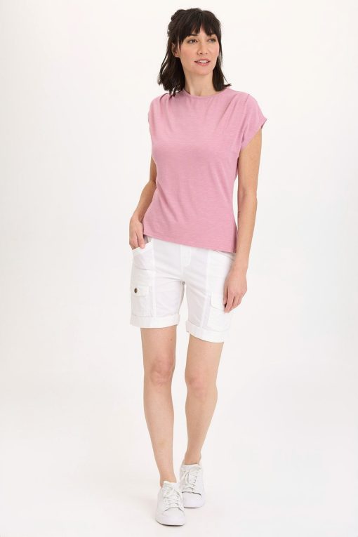 Two pleats adorn the shoulders of this mock neck classic silhouette. In our breezy slub jersey, comfort and style are hand in hand with this stunner.