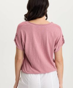 In a traditional XCVI silhouette, Bower V-Neck Tee has tabbed short sleeves, mesh trim inserts, a cinchable bubble hem and a contrasting slub jersey back panel.