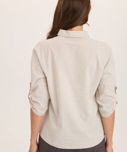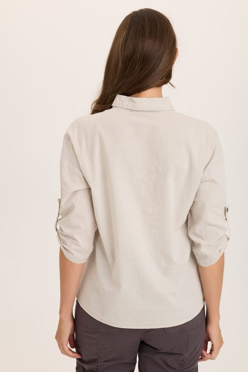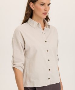 A simple warm weather button-up, the Carrie has 3/4 sleeves with tabbed details, coconut buttons and a slight high low hem.