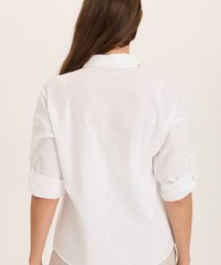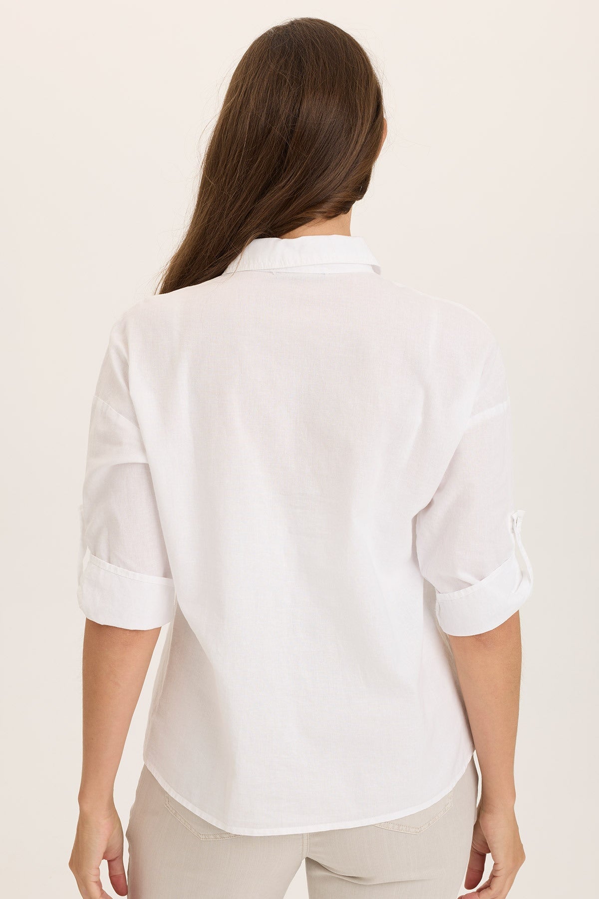 A simple warm weather button-up, the Carrie has 3/4 sleeves with tabbed details, coconut buttons and a slight high low hem.