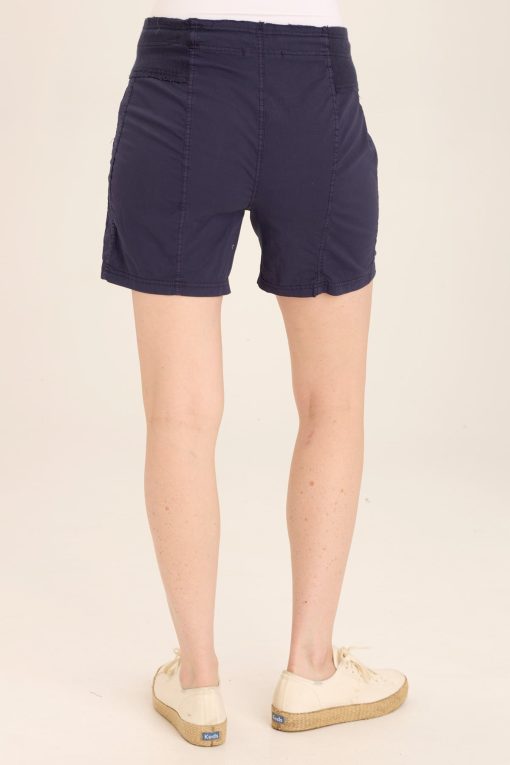 This classic poplin drawstring-waist short features a raw-edge contrast ribbed waistband, twill tape details, and cargo pockets with flat snaps.