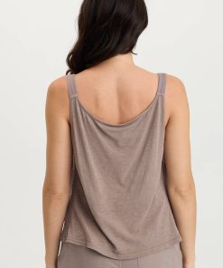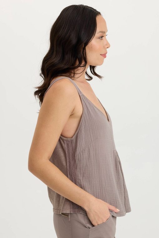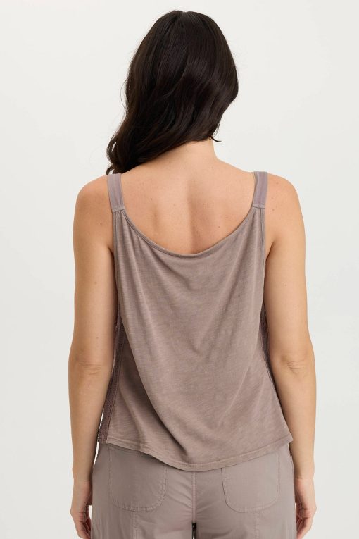 A cute double box pleat is featured front and center on this twill tape strapped tank. With mesh trim inserts and a contrasting slub jersey back panel.