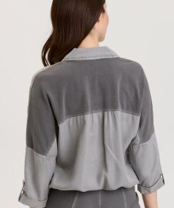 A light throw-on-able jacket is just what you need. Lucky day! Ilyse has a sequined looped flower design across the front panels of this cinchable hem, 3/4 sleeve jacket. Brass hardware abounds while a back contrast yoke compliments the drop shoulder look.