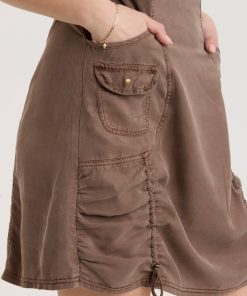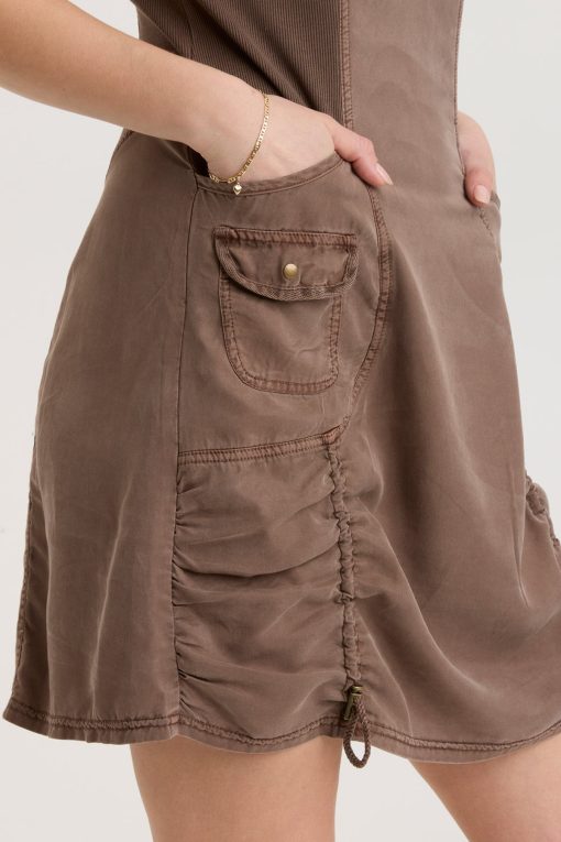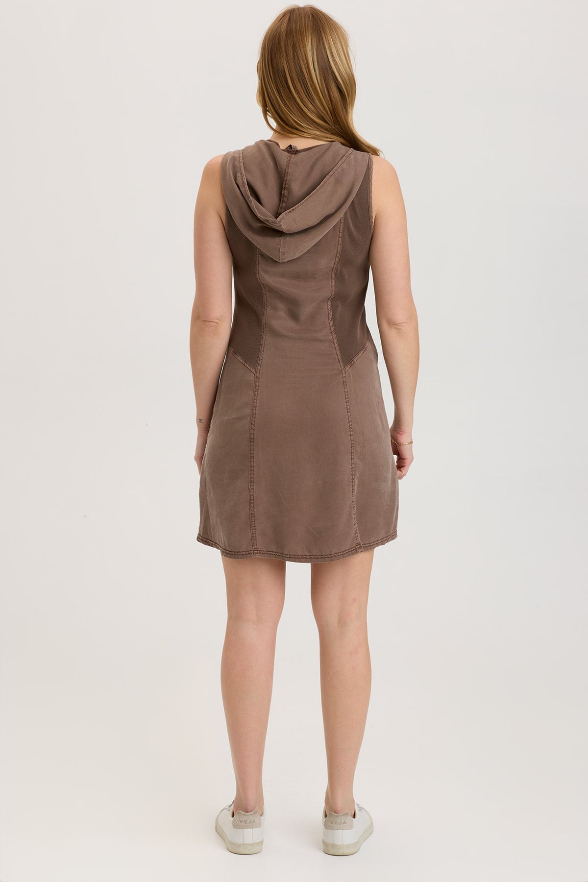 Hooded with tiny pockets on top of front pockets, this fun dress has cinchable front panels and contrast rib for comfort.