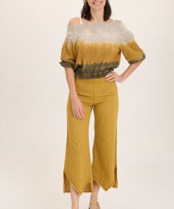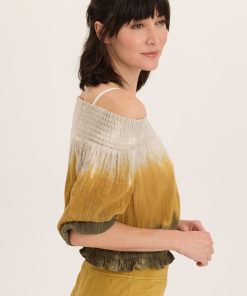 Billowing three-quarter sleeves with elastic bands pair up with layered elastic shirring at the neck so Jolia can be worn on or off the shoulder. A banded ruffle hem finishes this semi-cropped Cocoon Gauze style.