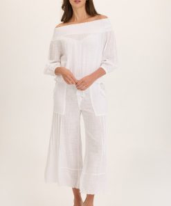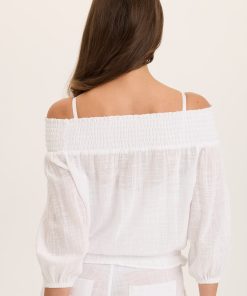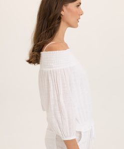 Billowing three-quarter sleeves with elastic bands pair up with layered elastic shirring at the neck so Jolia can be worn on or off the shoulder. A banded ruffle hem finishes this semi-cropped Cocoon Gauze style.