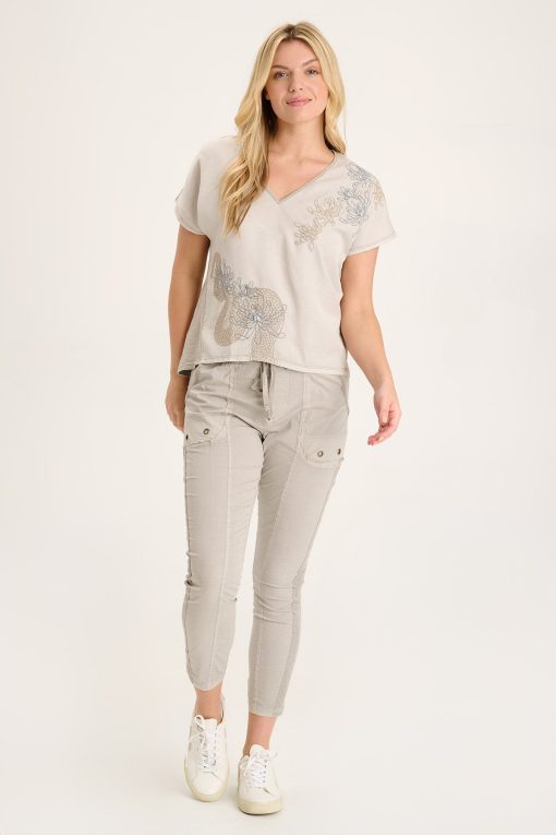 Another guest designer artwork piece, this v-neck tee has hand drawn embroidery and a back contrasting panel.
