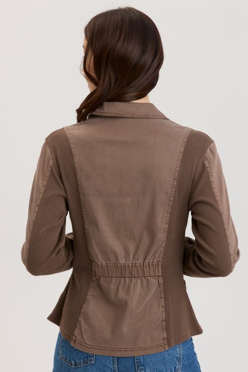 Sporty meets business in this zip front blazer. With rib contrast throughout and an elastic cinched waist, Keija brings fun pockets and striped cuffs new life.