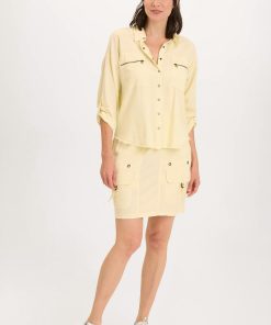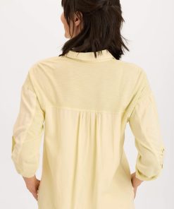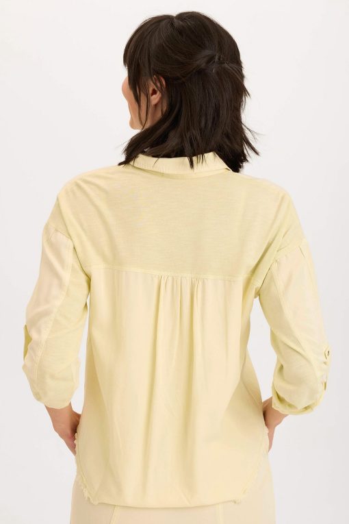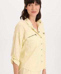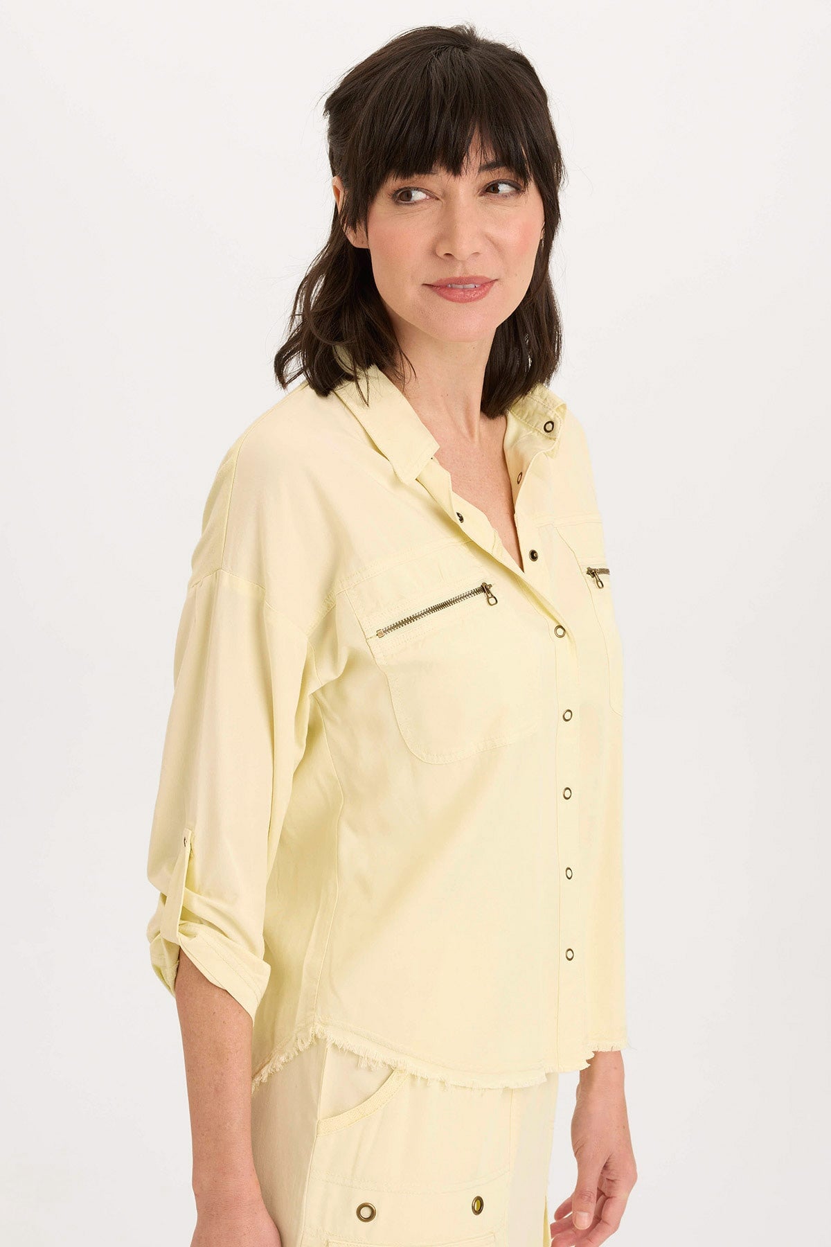 Tabbed three-quarter sleeves, zippered breast pockets, a classic collar, and a raw-edge hem round out this utility-inspired cargo shacket.