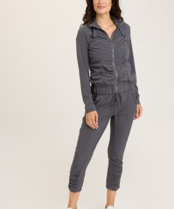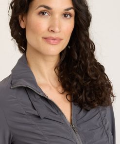 Maximum performance meets the Momentum Jacket in flexible Whisper 4-Way Stretch fabric, designed for sweat-resistant movement and easy comfort. Momentum features allover ruching on the front, an elastic cinched hemline, and a belted buckle detail at the collar for some added chic. Wear for movement or style with a casual bottom for sartorial excellence! Activewear never looks so stylish!