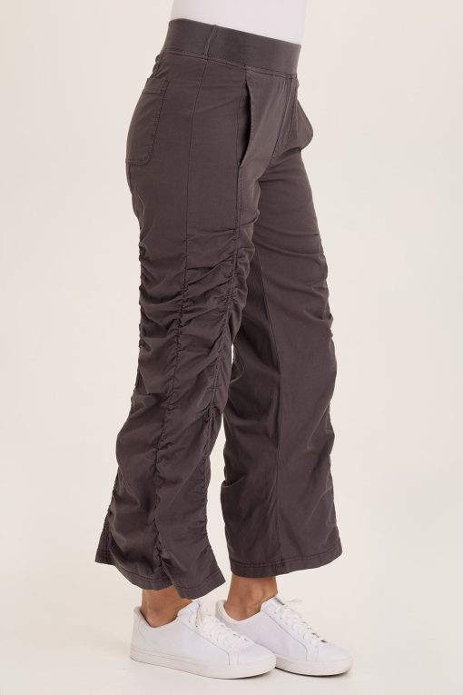 A pull-on stretch waistband and allover ruching adorn this flared split-hem gaucho style in lightweight Stretch Poplin.