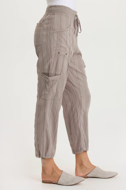 A cinchable leg, textured gauze pull-on crop, Ryle has front pleats, two welted cargo pockets, and two front and two back pockets.