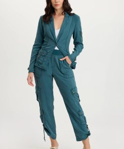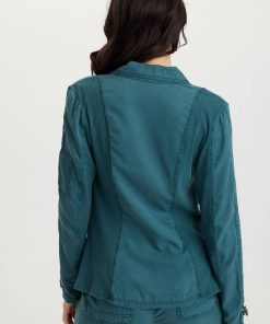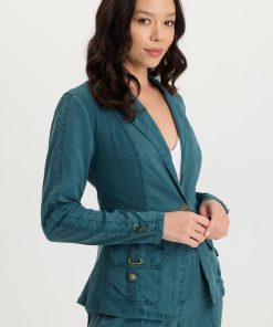A one button, 3/4 sleeve blazer styled jacket, Stratford features brass hardware front pockets and a cinchable sleeve with cord and slider detail and a back open pleat. With rib inserts for movement and flexibility; no more uncomfortable blazers here!