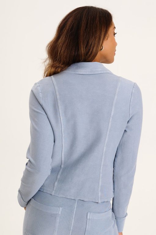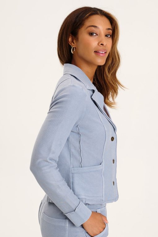 This slightly cropped blazer features raw edge details, three button closure, front pockets and a stretchy comfort knit.