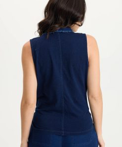Our newest favorite “denim alternative” takes a spin with Tague, featuring a front tie, snap-up collared shirt with a high-low hem and indigo colored jersey contrast back.