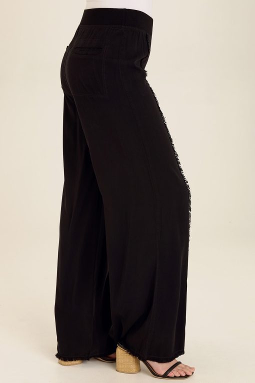 This wide leg trouser is now in our super soft Taissa. Features a pull-on elastic waistband, faux fly, style lines with raw edges, back pockets, and raw edge hems.