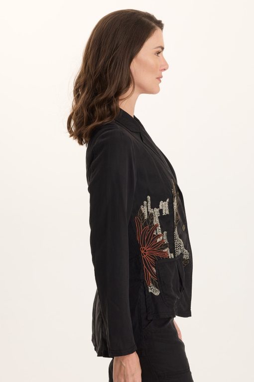 Artisan floral embroidery graces this style with a novel touch. An elongated two-button blazer in lightweight Soft Twill, Danski offers a flattering, polished look with functional details and an artful touch.
