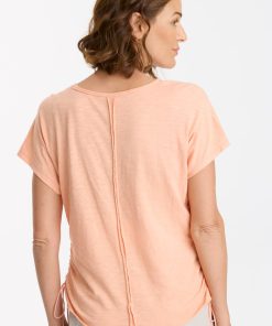 Cinchable side cords grace this v-neck slub jersey top; also featuring a front yoke, dolman sleeves, and raw-edge details throughout.