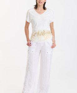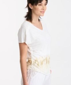 Cinchable side cords grace this v-neck slub jersey top; also featuring a front yoke, dolman sleeves, and raw-edge details throughout.