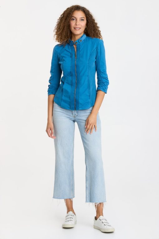 She’s back! A stylish, elevated, track jacket-inspired piece of lightweight outerwear, Janet is all for you! Featuring a stand collar with button details, rib inserts at the sides and at the 3/4 sleeves for an impeccable and comfortable fit, twill details at the zipper front, two front in-seam pockets, and ruching on the sleeves and back, Janet is as full of details as she is life!