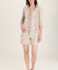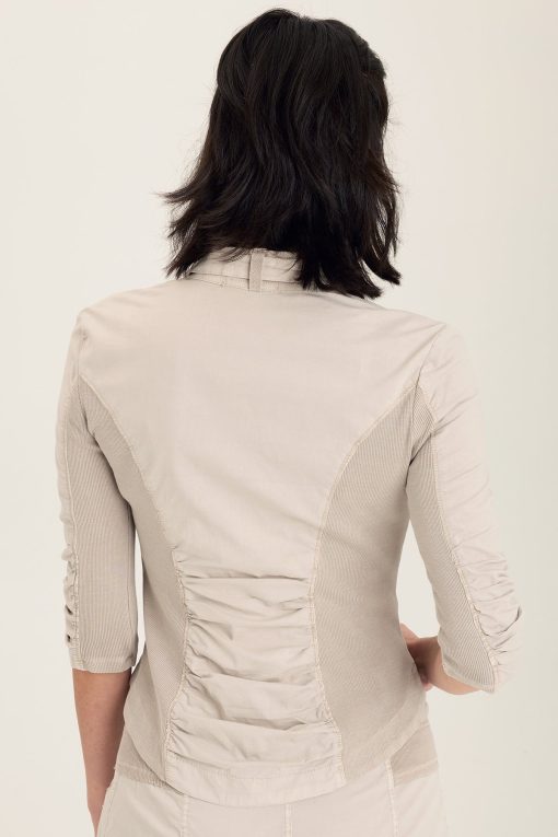 SheÕs back! A stylish, elevated, track jacket-inspired piece of lightweight outerwear, Janet is all for you! Featuring a stand collar with button details, rib inserts at the sides and at the 3/4 sleeves for an impeccable and comfortable fit, twill details at the zipper front, two front in-seam pockets, and ruching on the sleeves and back, Janet is as full of details as she is life!