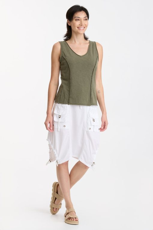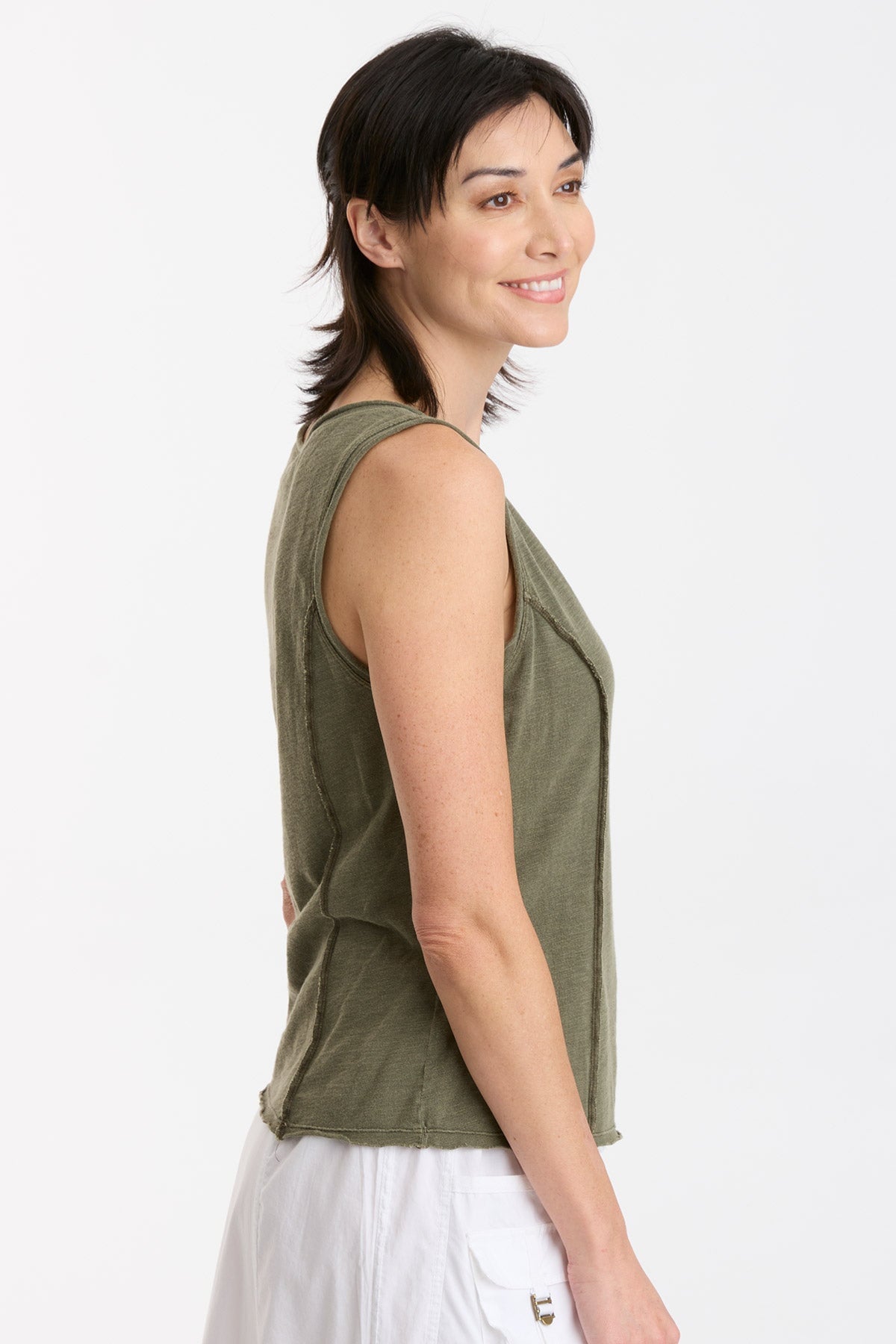 In slub jersey, the bra-friendly Laramie Tank features reversed stitched princess seams, a v-neck cut, and raw-edge details at the neck, hem, and armhole.