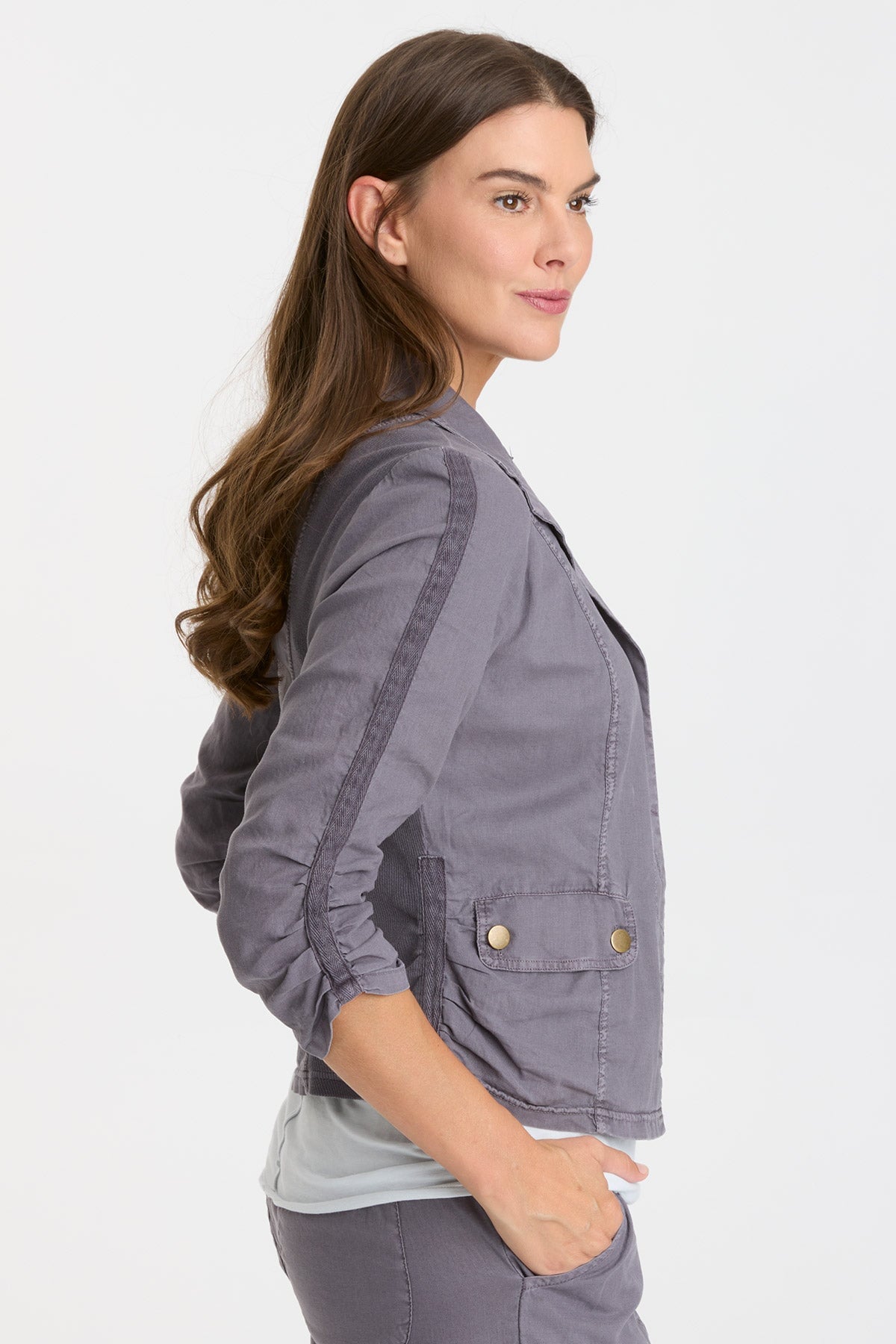 Our favorite four pocket blazer is back in linen this go around! With shirred sleeves, a slightly cropped silhouette and contrast back rib panels for a comfortable fit; Folksy Jacket is a classic winner!