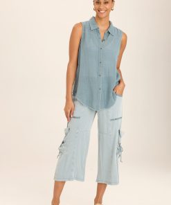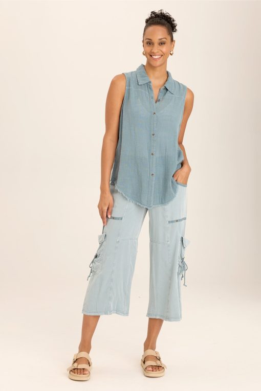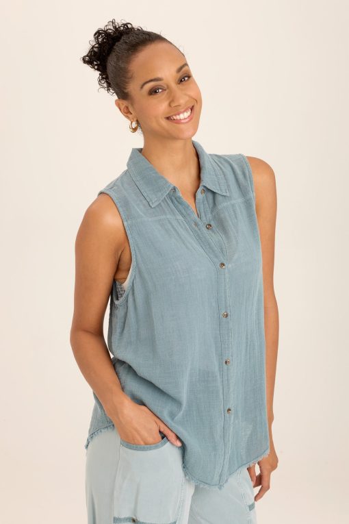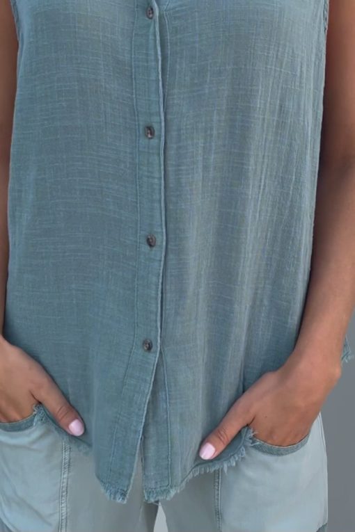 A traditional button-up style tank with a front and back yoke paired with raw edge details, made in our breezy cotton gauze.