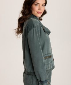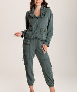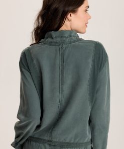 A voluminous collar with corded adjustable ruched channels, a three-brass button closure, and zippered pockets make this relaxed-fit twill style a visual feast!