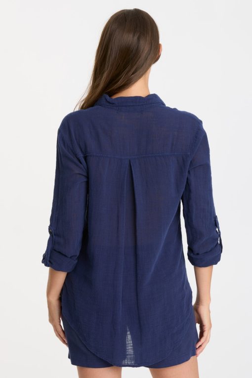 This gauze button-up blouse is great for layering. Features tabbed sleeve for easy rolling, curved hemline, and a box pleat on back.