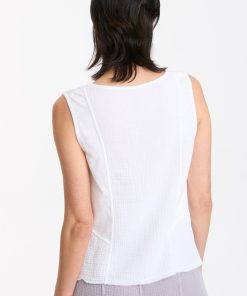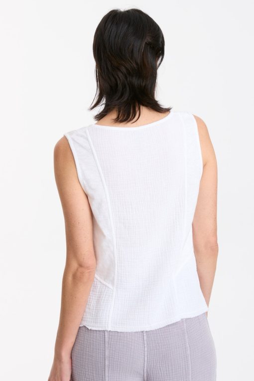 In plush Double Gauze, this v-neck tank features bra-friendly straps, contrasting jersey panels, a raw-edge hem, and side-seam splits for some extra pizzazz.