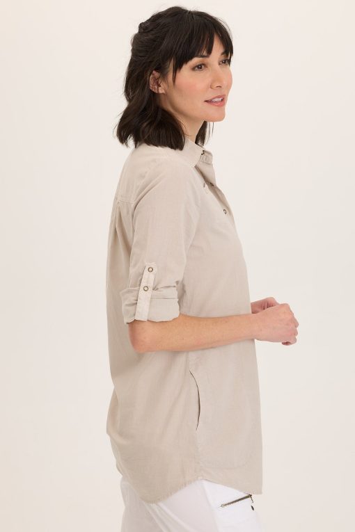 A classic XCVI body brought back to delight with a long tunic style silhouette and a snap-up front closure. Featuring rollable tabbed sleeves, two welt breast pockets and a yoked back pleated panel.