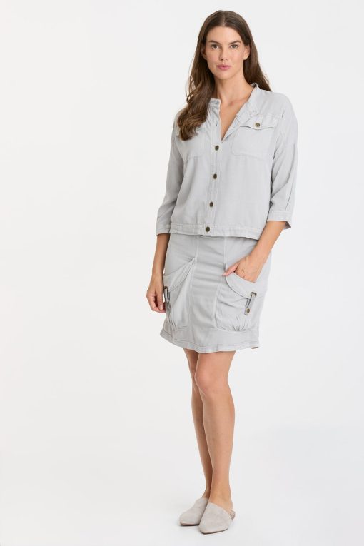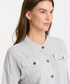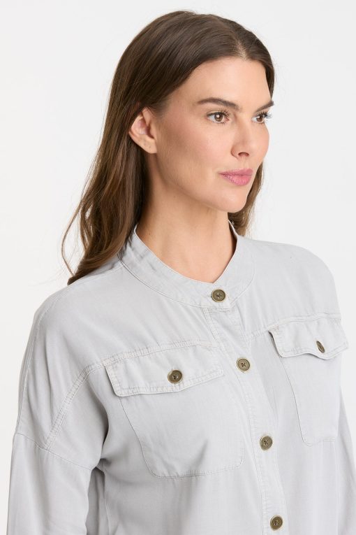 Now available in Taissa Twill, Colbert offers lightweight outerwear with a high collar, and buttons down the center and at the flapped breast pockets. A slightly boxy fit and three-quarter sleeves finish off this clean, classy look.