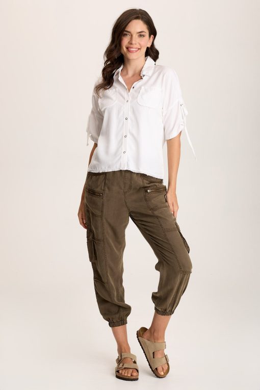 A soft twill tabbed short-sleeve blouse featuring raw edges at the hem and breast pockets, with antique brass snaps and a classic collar. Wear it layered and open, or snapped all the way up; either way, Vinton is the perfect fit for you!